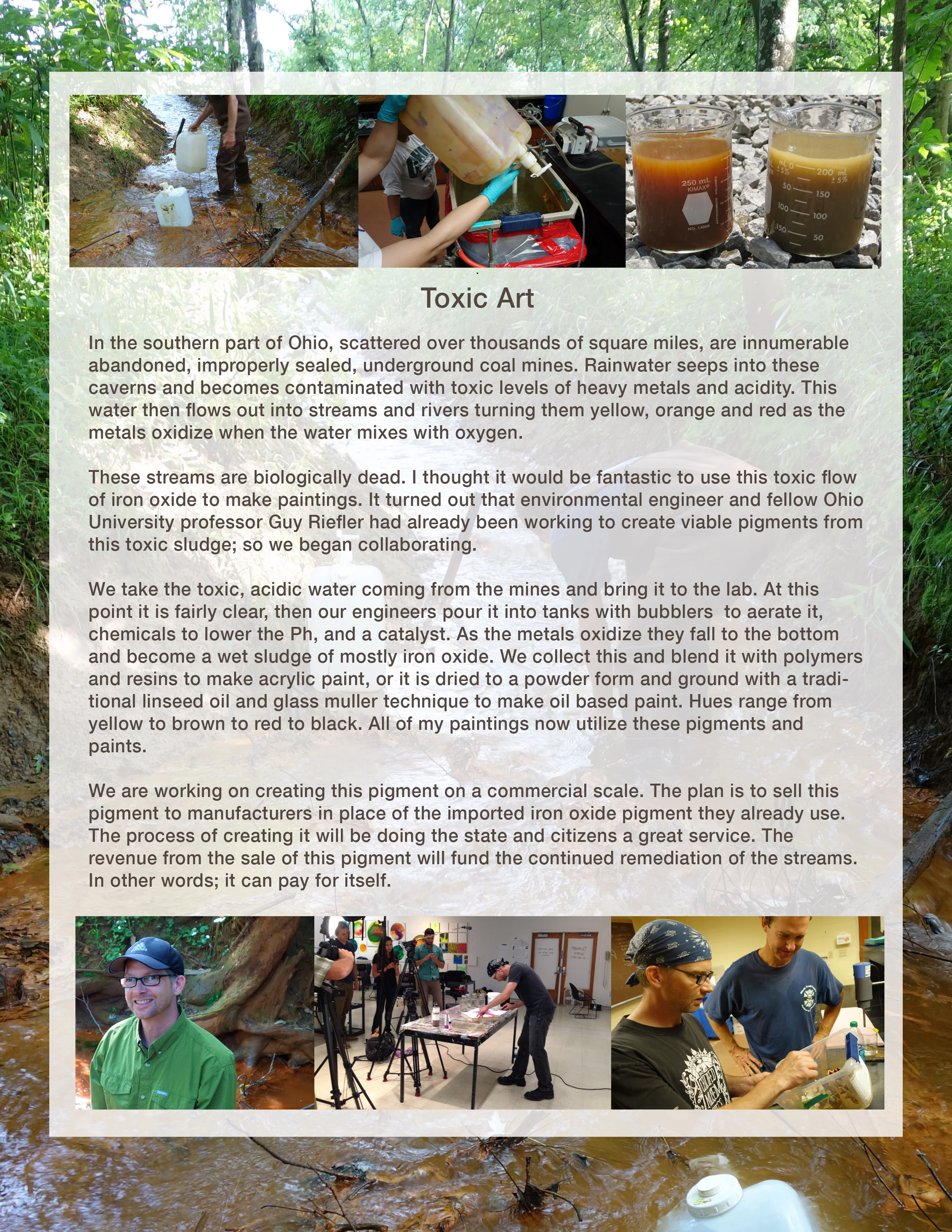 Toxic Art is a short documentary about artist John Sabraw's latest series of paintings and collaborations with South-Eastern Ohio researches and engineers. Through different processes, acid mine drainage is transformed into the pigment used to create the large scale, environmentally conscious paintings. Shot and edited by Jacob Koestler Music by Aaron Butler Narration by R. Guy Riefler & John Sabraw Featuring: John Sabraw Artist, Associate Professor of Art - Ohio University School of Art and Design R. Guy Riefler, PhD, PE Associate Professor of Civil Engineering - Russ College of Engineering and Technology Elaine Goetz PhD candidate in Civil Engineering, graduate researcher Alex Doksa MS candidate in Civil Engineering, graduate researcher Joe Cook BS student in Civil Engineering, undergraduate researcher Links: www.johnsabraw.com www.jacobkoestler.com www.facebook.com/nobrow.music.collective Special thanks to Nathaniel Berger at CREATE_Space for the resources and support